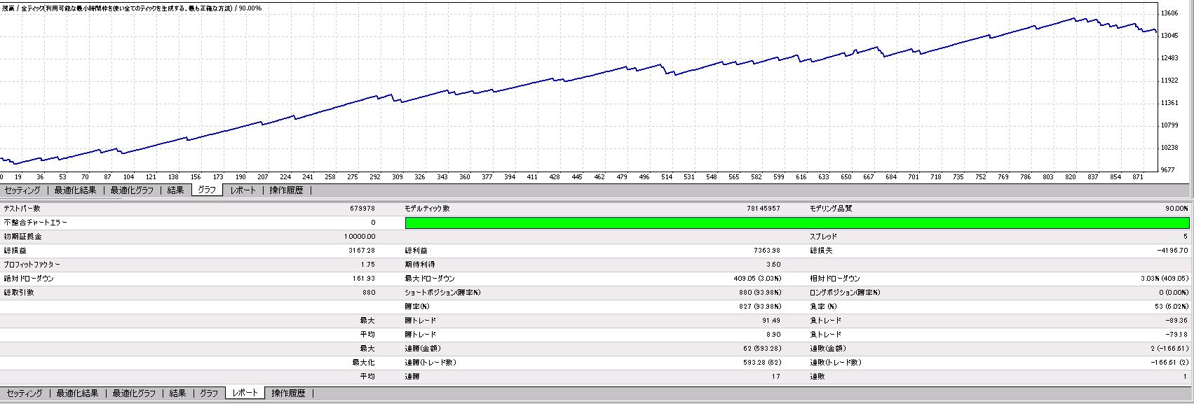 プロフィットファクター1.75。上のと比較すると良くなってる。グラフもこのくらいすーっと右上がりだと安心ね。