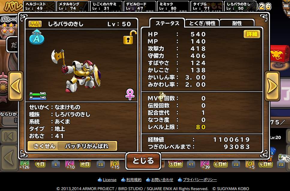 それより上のハートナイトと比べるとこっちはランクA段階で攻守ともに勝ってる……が他ステはかなり水をあけられてる。こちらは二回行動しないのを考えるとうち的にはハートナイト。ルカニ攻撃はメタル祭りや異界で使えそうなんだけど異界ボスは防御下げたところでなんだよなー。道中と取り巻きには有効かね。